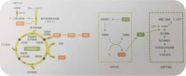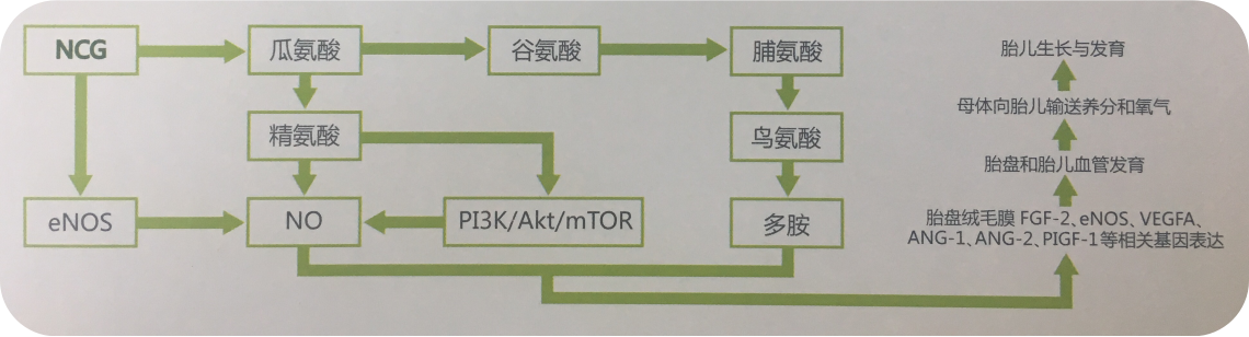 注:動(dòng)物體內(nèi)添加NCG,通過尿素循環(huán),促進(jìn)內(nèi)源精氨酸合成與代謝,產(chǎn)生NO和多胺。NO可使血管平滑肥舒張,促進(jìn)毛細(xì)血管生成,增加機(jī)體微循環(huán),提高多胎動(dòng)物繁殖性能,促進(jìn)幼齡動(dòng)物的生長發(fā)育。